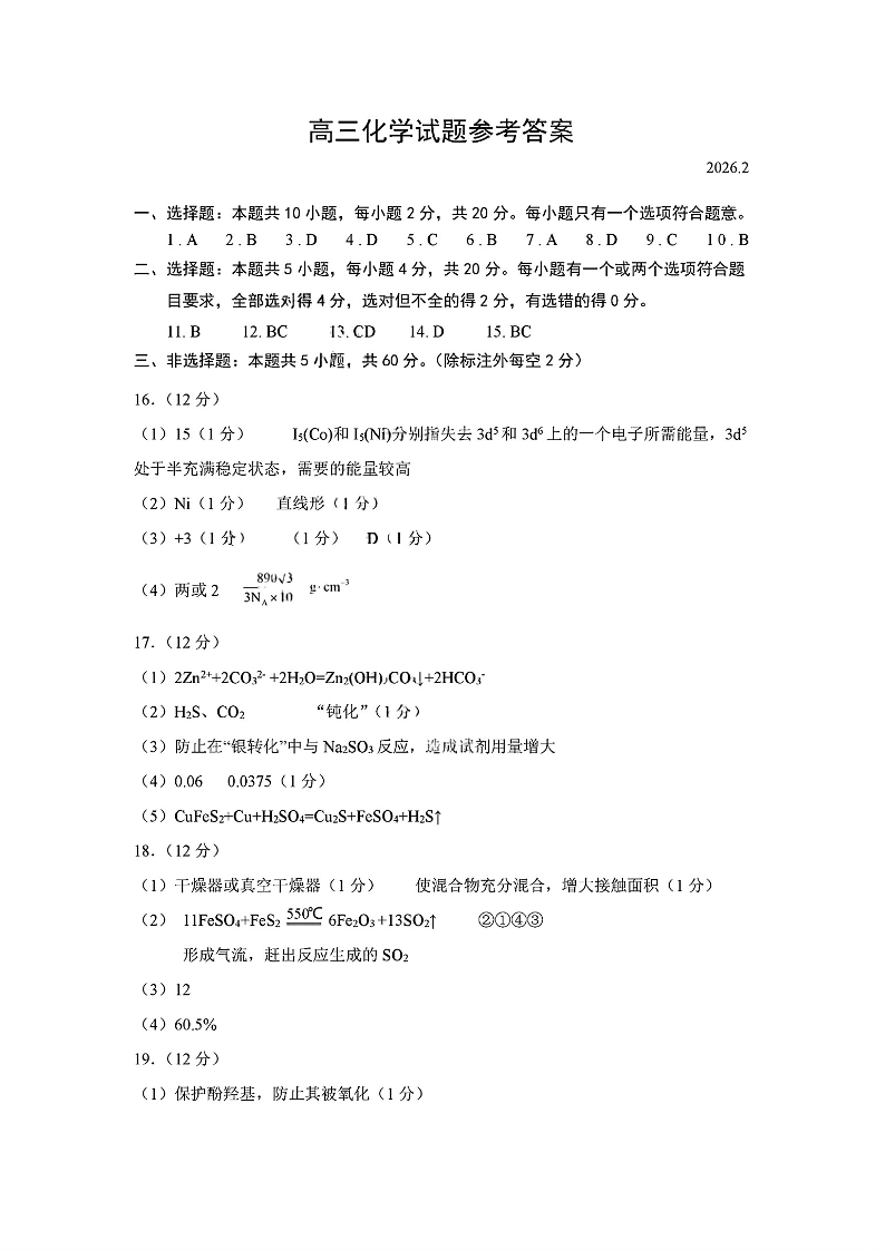 高三化学答案--山东菏泽市2026届高三下学期3月一模考试
