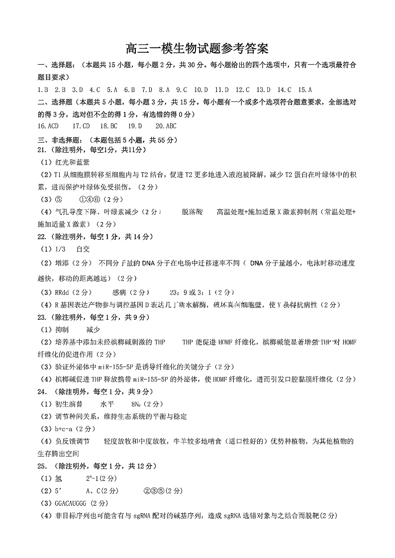 高三生物答案--山东菏泽市2026届高三下学期3月一模考试