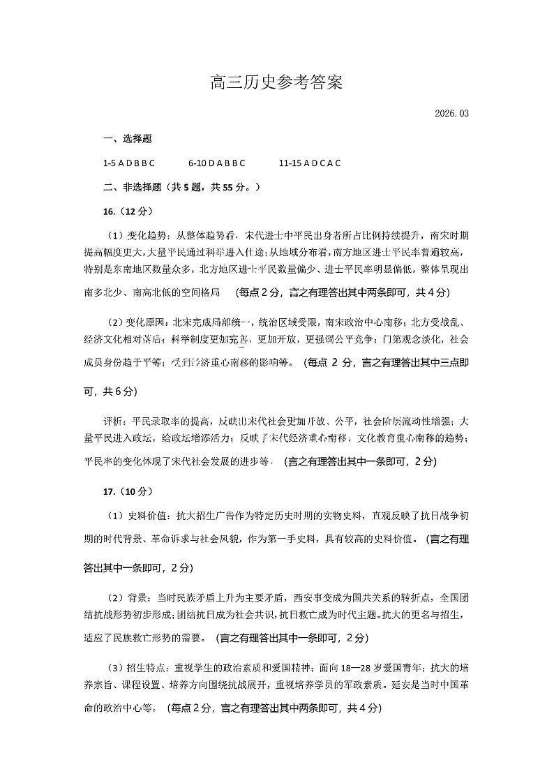 高三历史答案--山东菏泽市2026届高三下学期3月一模考试