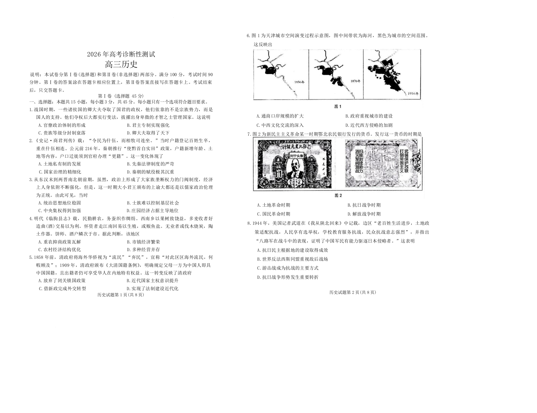 高三历史--山东烟台市2026届高三下学期诊断性考试(烟台一模)