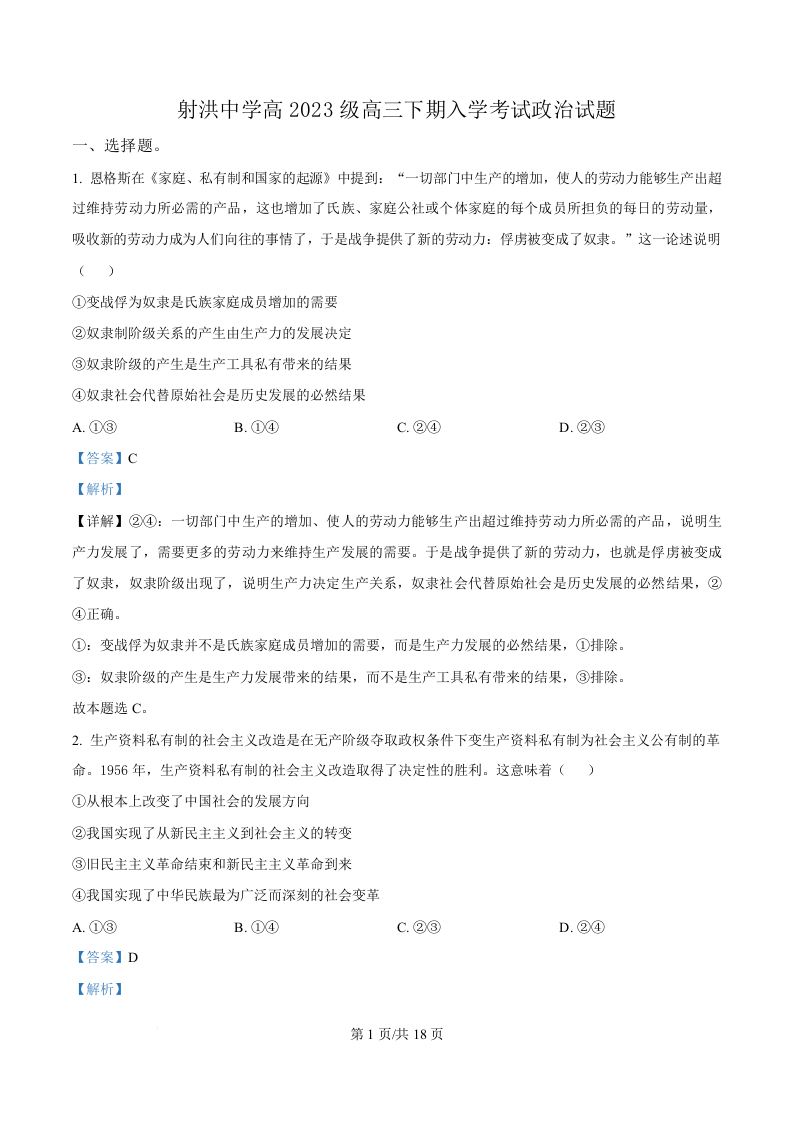 高三政治(解析版)--四川省射洪中学校2026届高三下学期3月入学考试