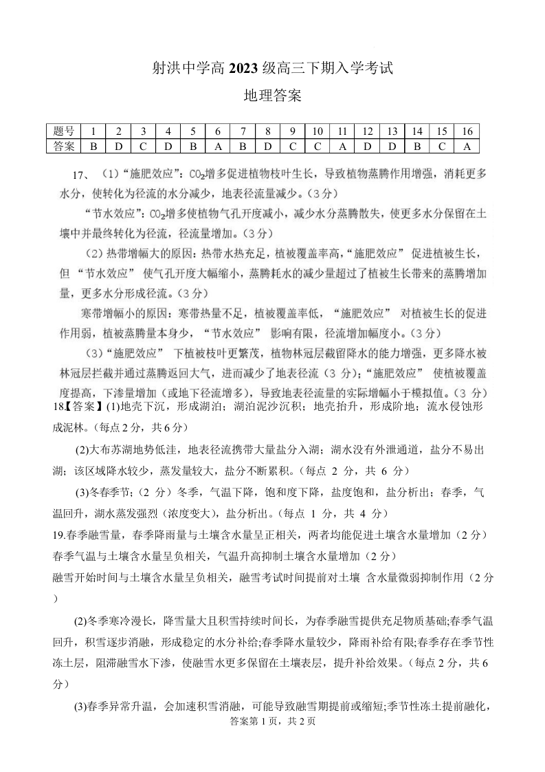 高三地理答案--四川省射洪中学校2026届高三下学期3月入学考试