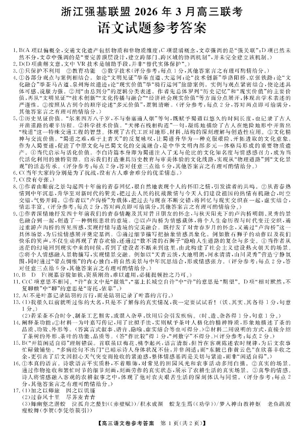 高三语文答案--浙江强基联盟2026届高三下学期3月联考(二模)
