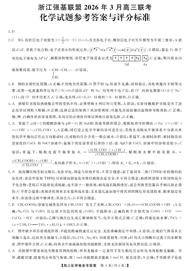 高三化学答案--浙江强基联盟2026届高三下学期3月联考(二模)