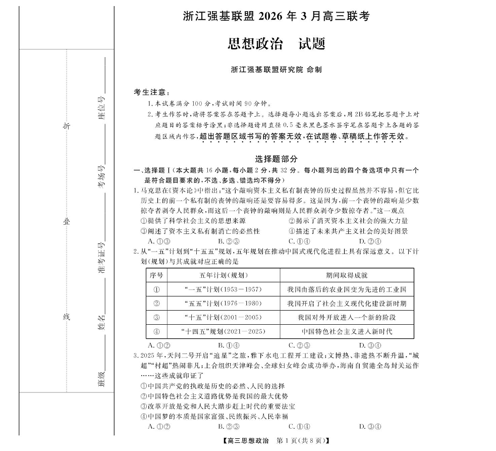 高三政治--浙江强基联盟2026届高三下学期3月联考(二模)