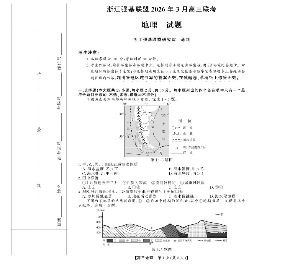 高三地理--浙江强基联盟2026届高三下学期3月联考(二模)