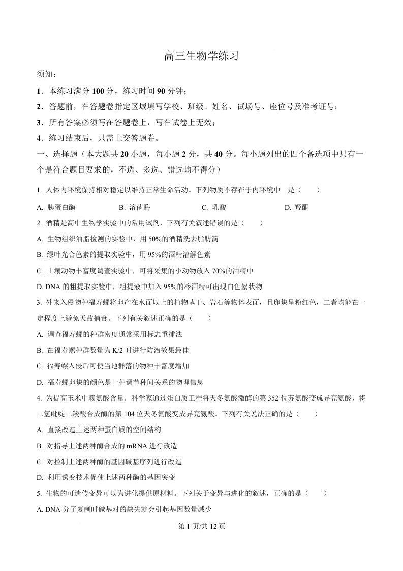 高三生物(原卷版)--浙江省名校协作体G12联盟2026届高三下学期3月二模考试