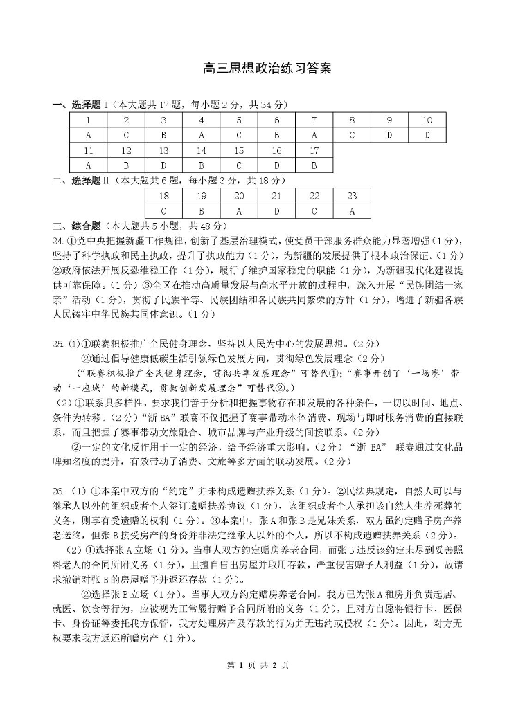 高三政治答案--浙江省名校协作体G12联盟2026届高三下学期3月二模考试