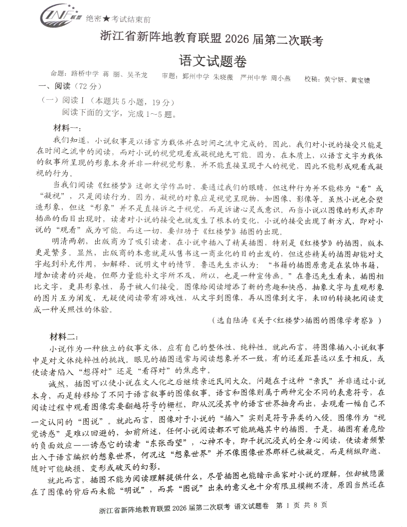 高三语文--浙江新阵地教育联盟2026届高三下学期3月开学考试
