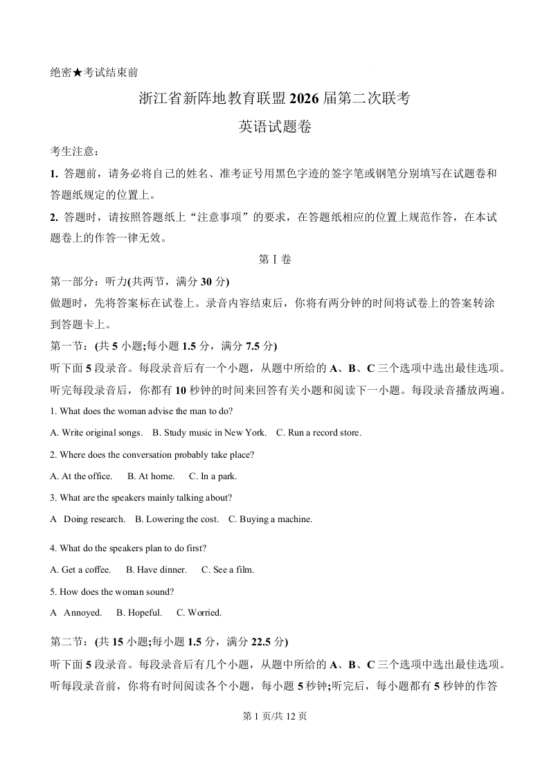 高三英语(原卷版)--浙江新阵地教育联盟2026届高三下学期3月开学考试