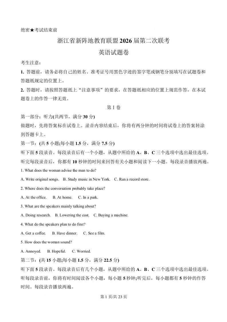 高三英语(解析版)--浙江新阵地教育联盟2026届高三下学期3月开学考试