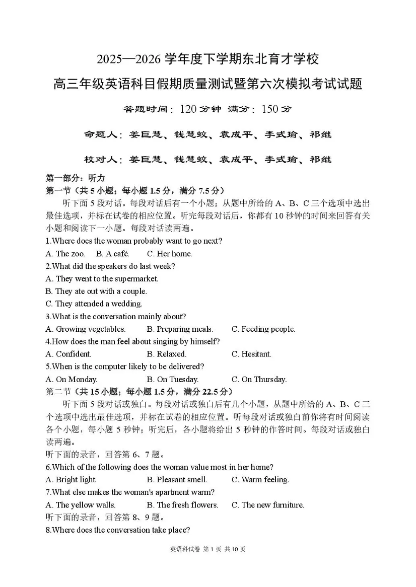 高三英语--辽宁省东北育才学校2026届高三下学期第六次模拟考试