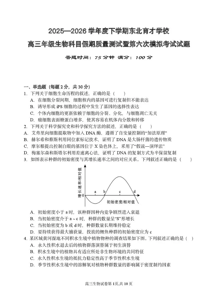 高三生物--辽宁省东北育才学校2026届高三下学期第六次模拟考试