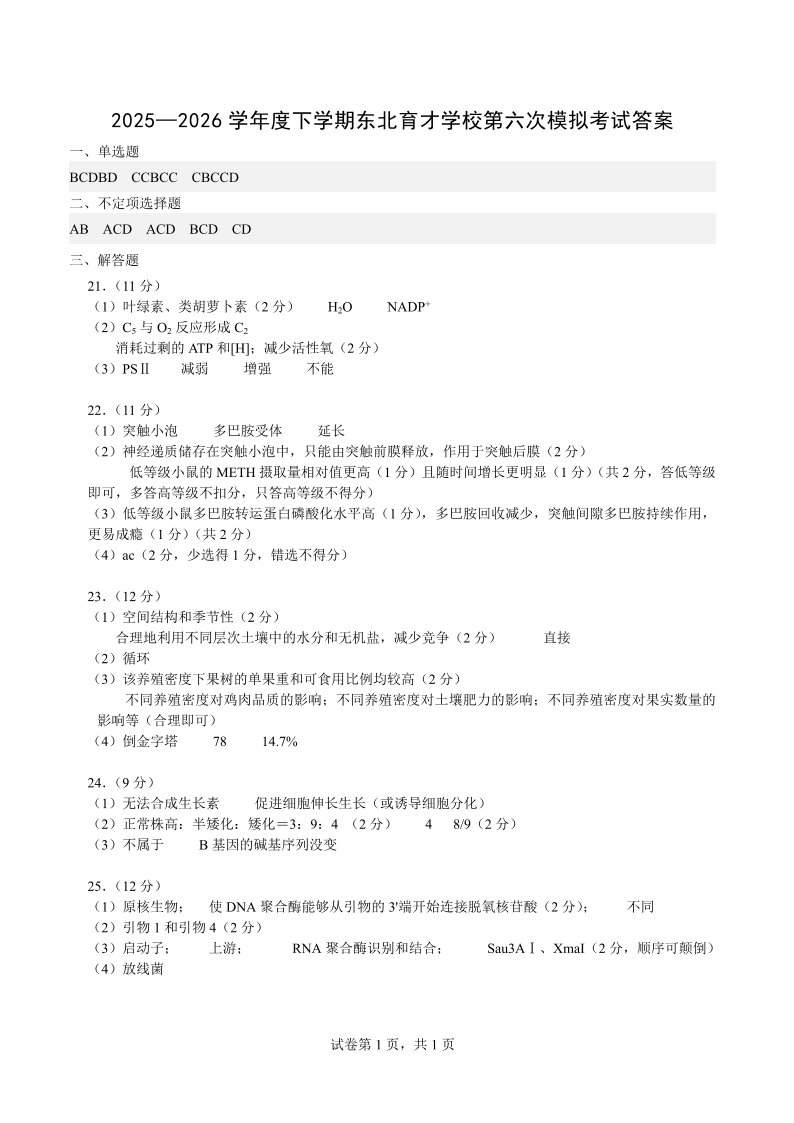 高三生物答案--辽宁省东北育才学校2026届高三下学期第六次模拟考试