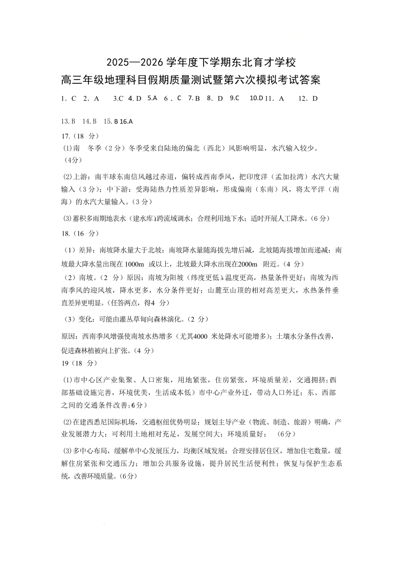 高三地理答案--辽宁省东北育才学校2026届高三下学期第六次模拟考试