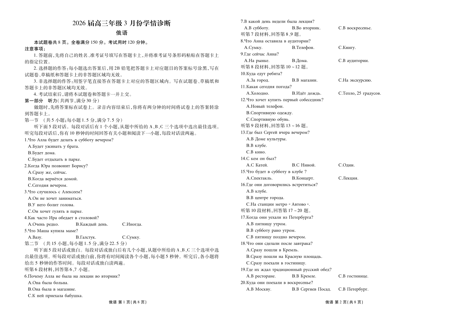 高三俄语--衡水金卷2026届高三年级3月份学情诊断