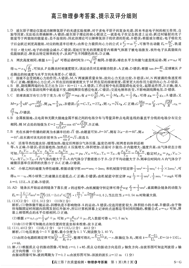高三物理答案--九师联盟2026届高三3月第7次教学质量检测巩固卷