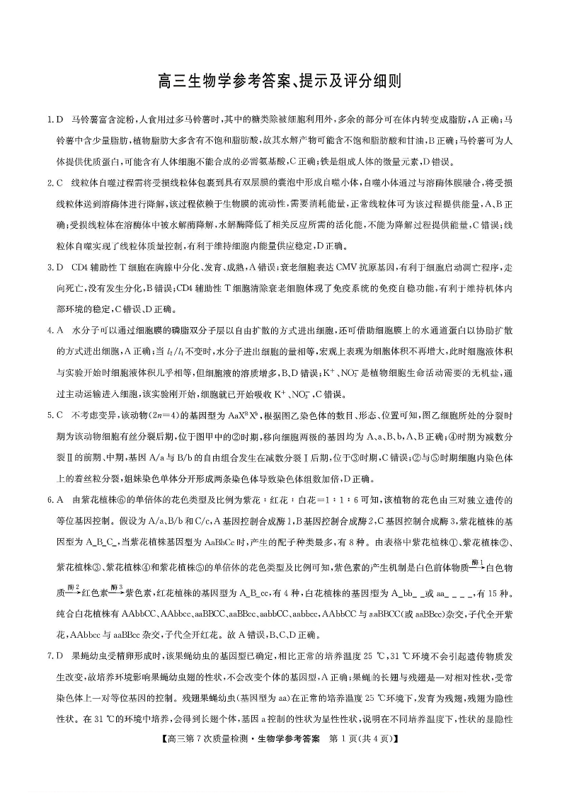 高三生物答案--九师联盟2026届高三3月第7次教学质量检测巩固卷