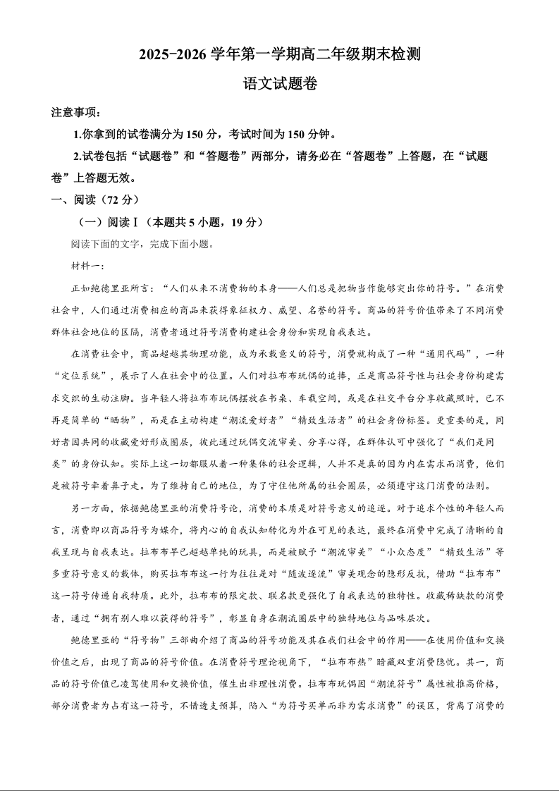 高二语文(精品解析版)--安徽省皖中名校2025-2026学年高二上学期2月期末联考检测