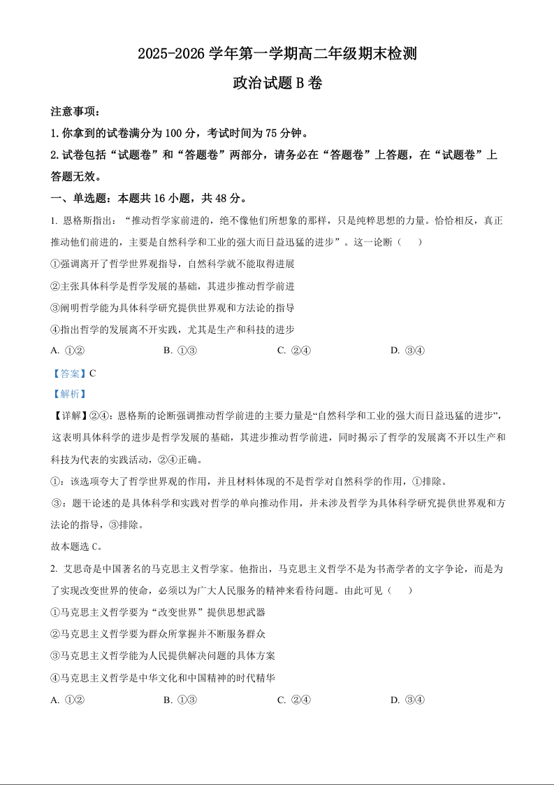 高二政治(精品解析版)--安徽省皖中名校2025-2026学年高二上学期2月期末联考检测