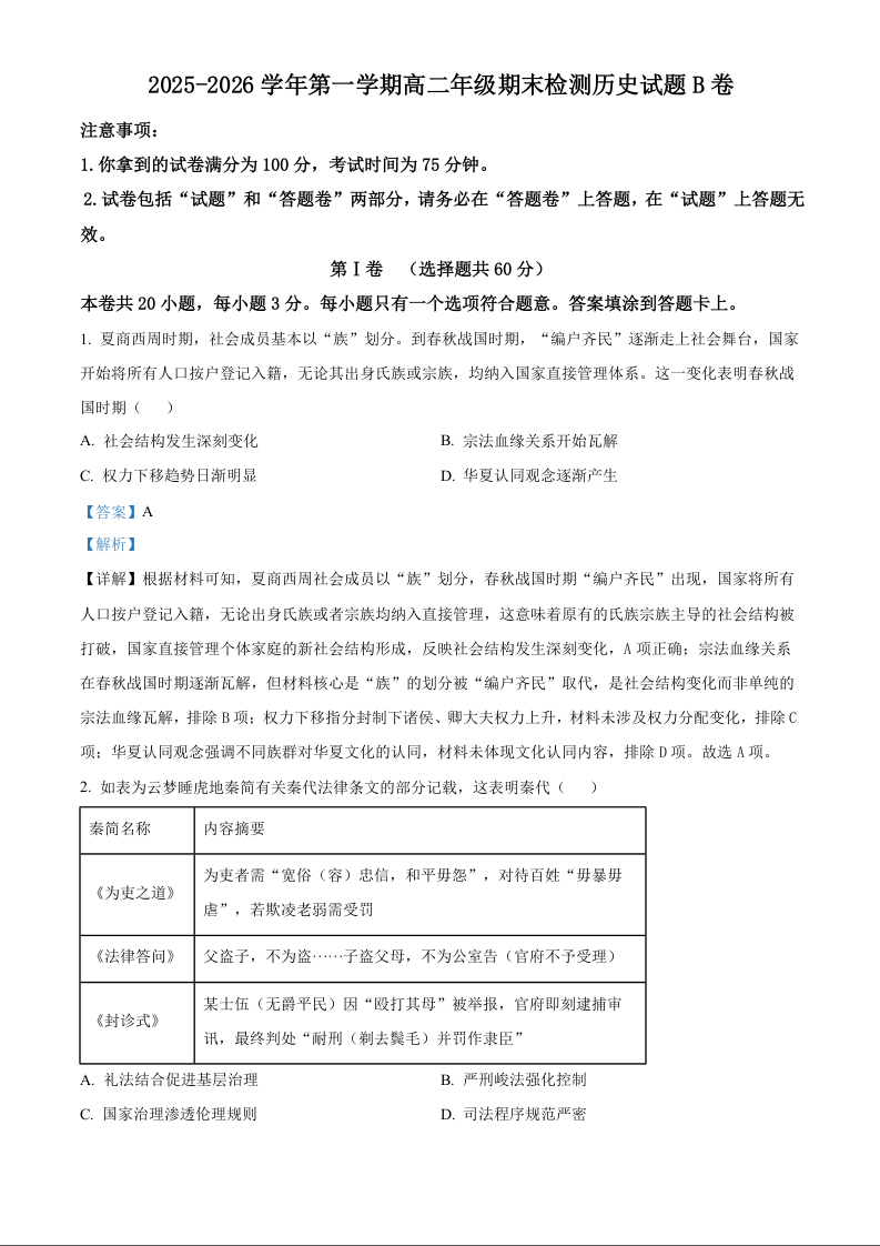 高二历史(精品解析版)--安徽省皖中名校2025-2026学年高二上学期2月期末联考检测