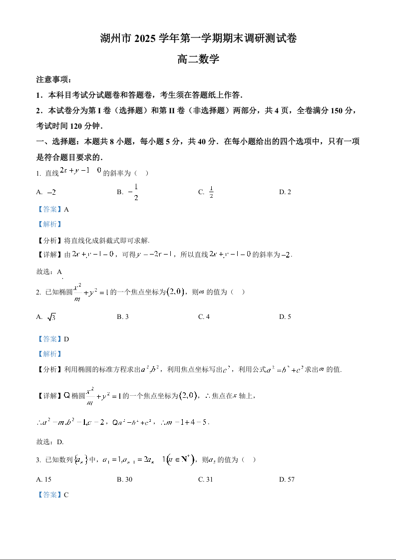高二数学答案--浙江省湖州市2025-2026学年高二上学期2月期末考试