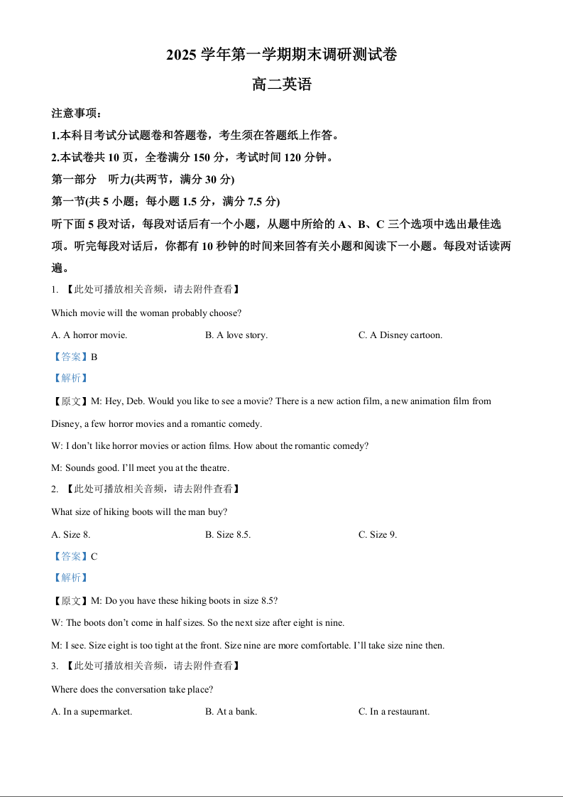 高二英语答案--浙江省湖州市2025-2026学年高二上学期2月期末考试