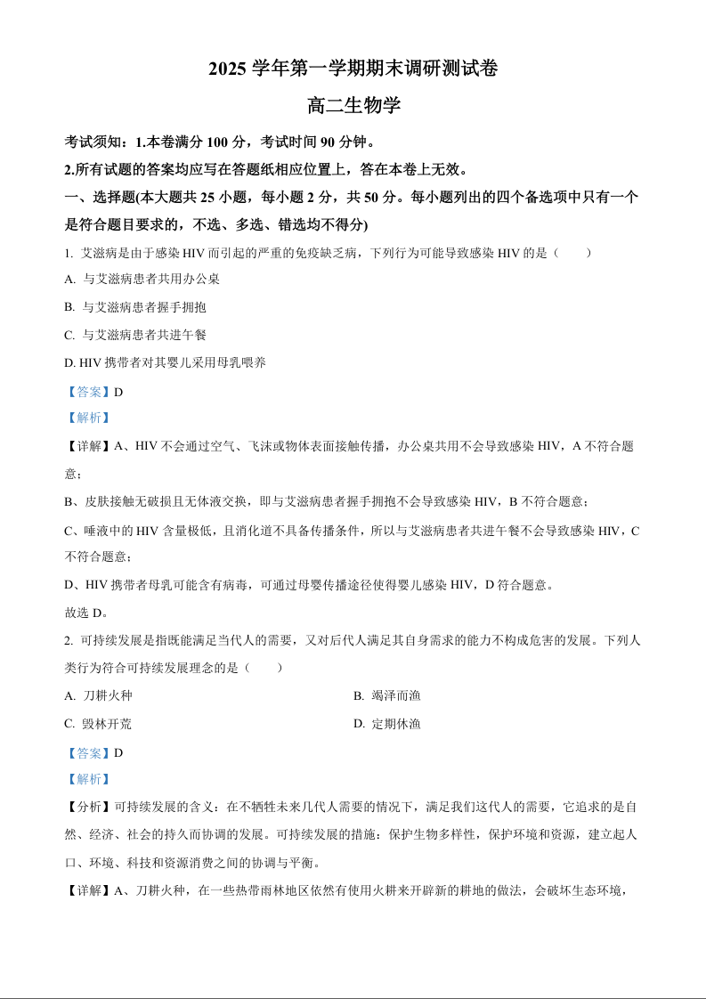 高二生物学答案--浙江省湖州市2025-2026学年高二上学期2月期末考试
