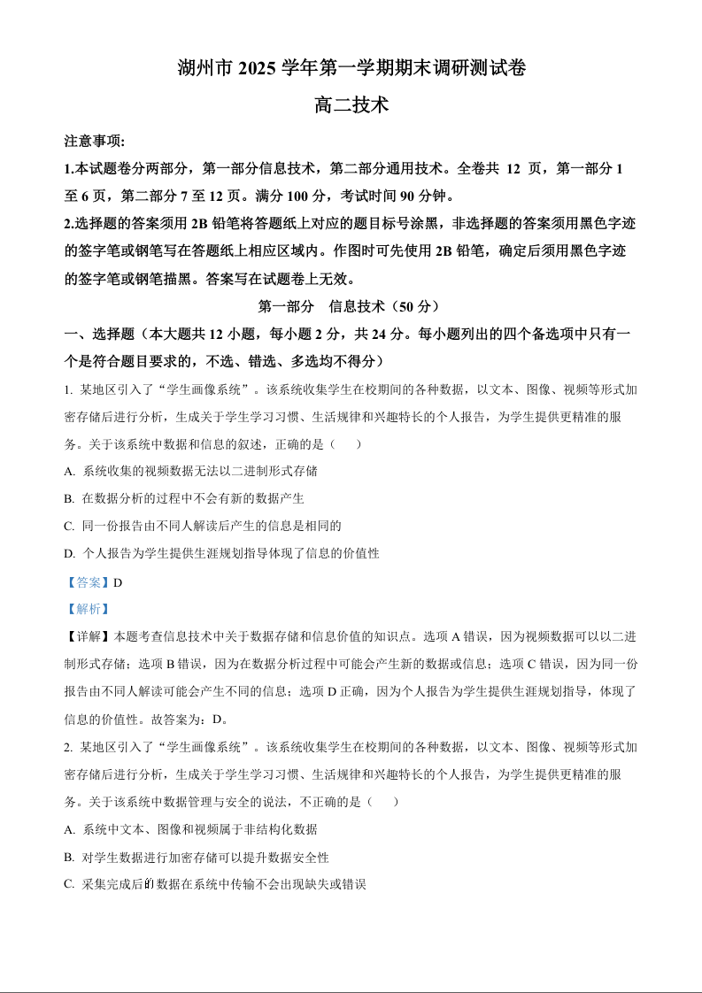 高二技术答案--浙江省湖州市2025-2026学年高二上学期2月期末考试