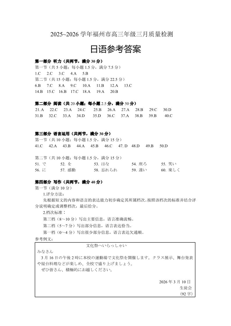 高三日语答案--福建省福州市2026届高三三月质量检测