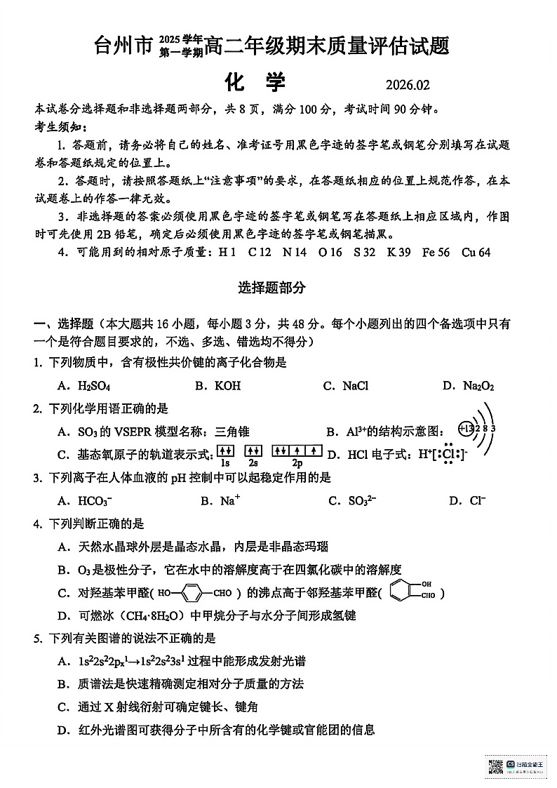 高二化学+答案--浙江省台州市2025-2026学年高二上学期期末考试