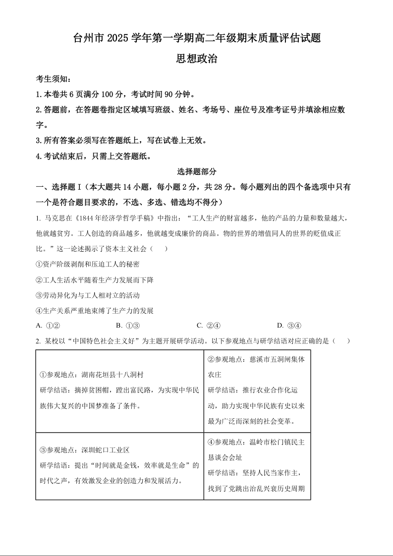 高二政治--浙江省台州市2025-2026学年高二上学期期末考试