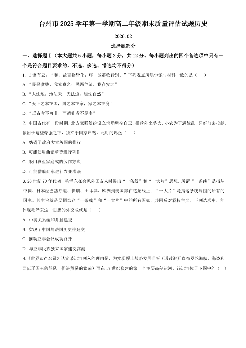 高二历史--浙江省台州市2025-2026学年高二上学期期末考试