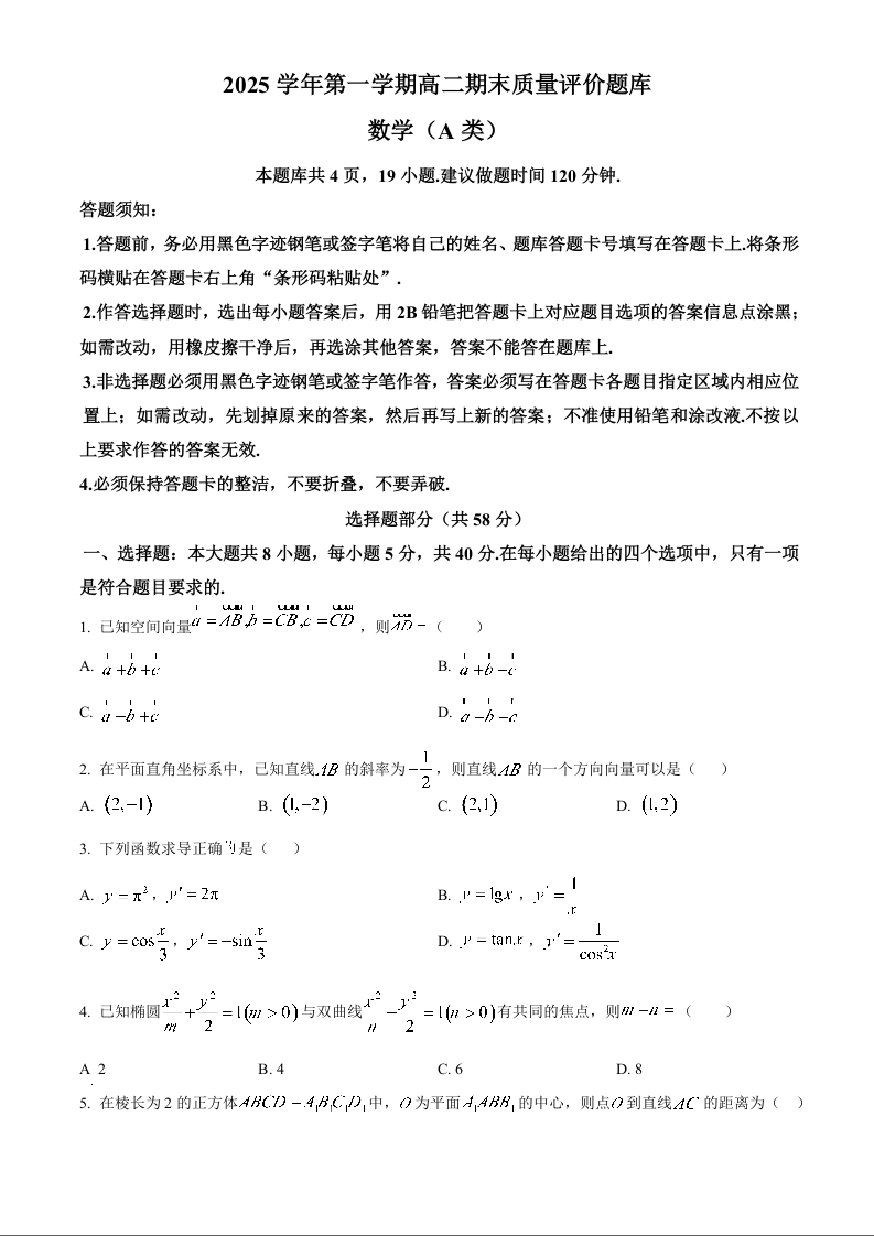 高二数学(A类)--浙江省温州市2025-2026学年高二上学期1月期末考试