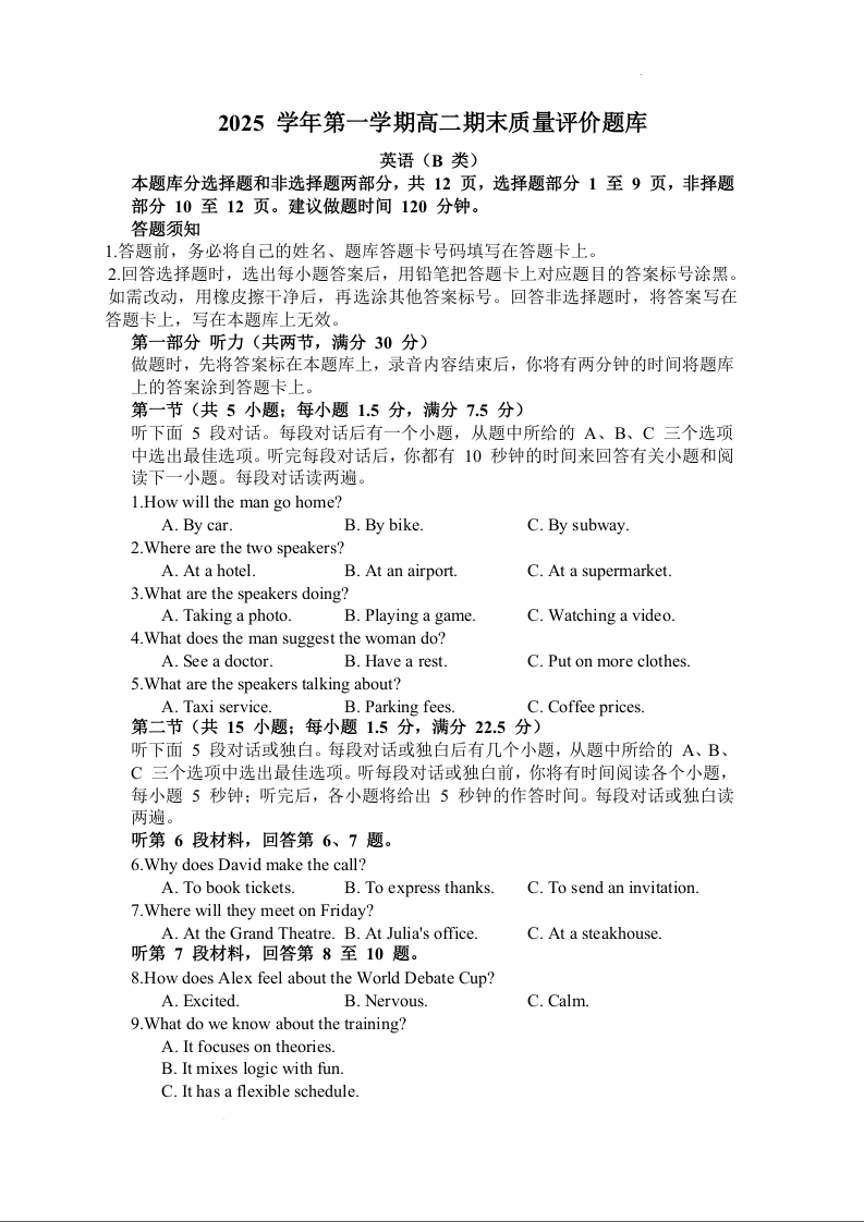 高二英语(B类)--浙江省温州市2025-2026学年高二上学期1月期末考试