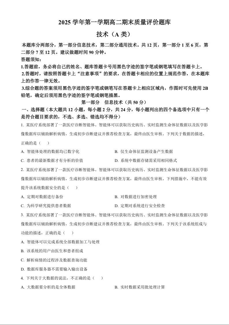 高二技术--浙江省温州市2025-2026学年高二上学期1月期末考试