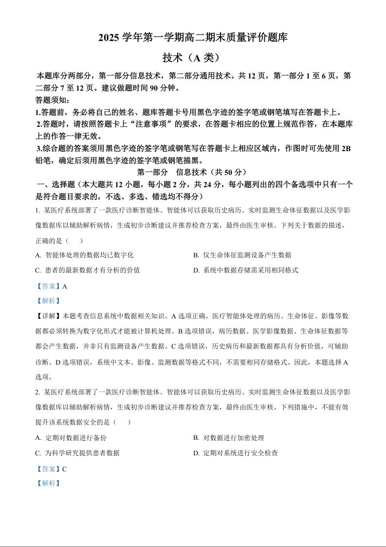 高二技术答案--浙江省温州市2025-2026学年高二上学期1月期末考试