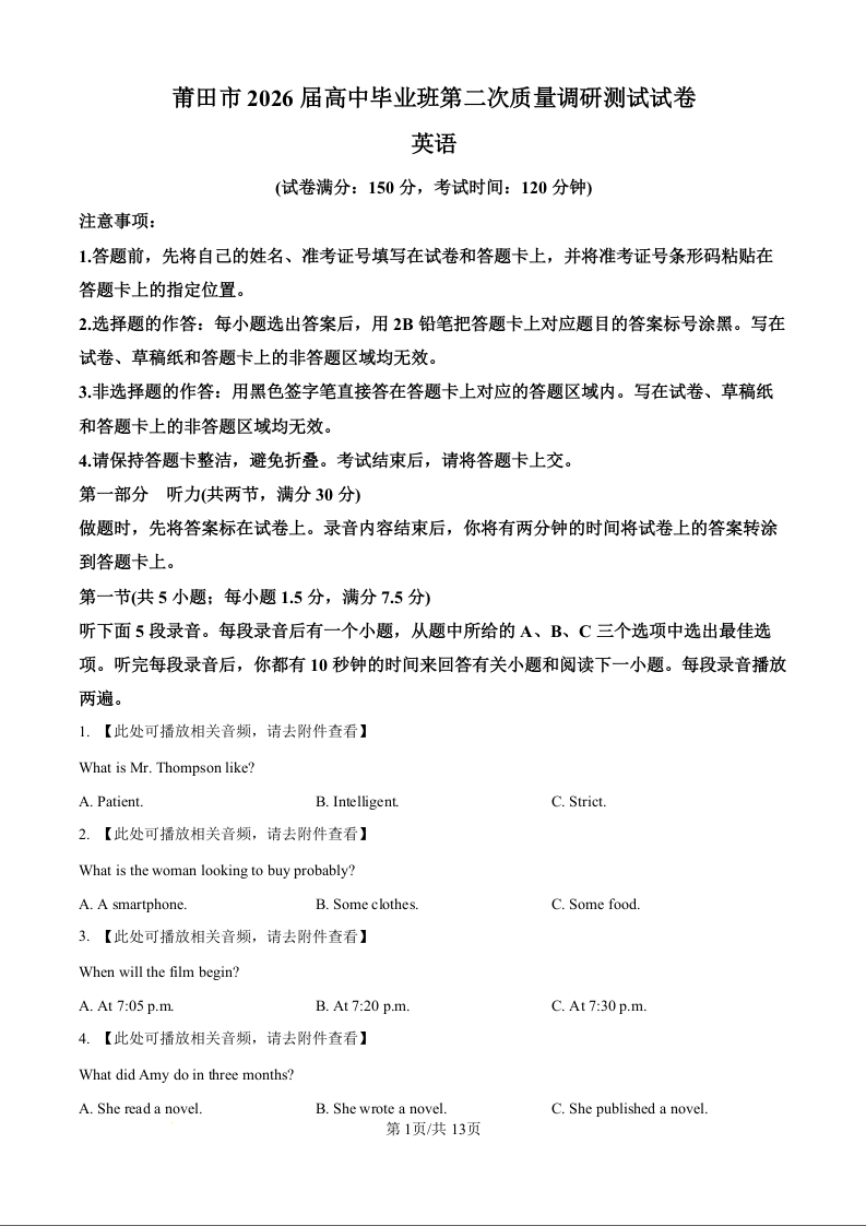 高三英语(原卷版)--福建省莆田市2026届高三下学期第二次质量调研
