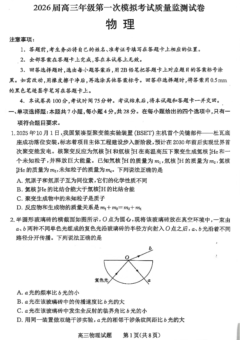 高三物理+答案--山西省大同市2026届高三第一次模拟考试质量监测