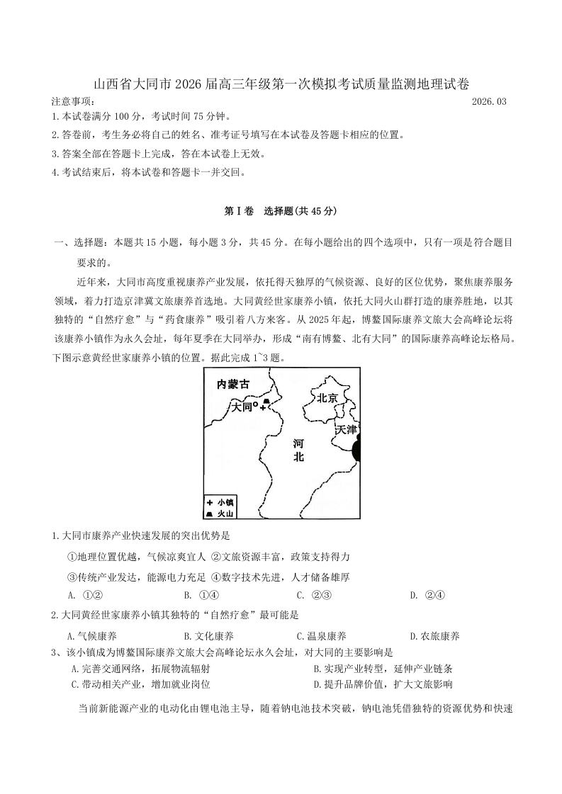 高三地理+答案--山西省大同市2026届高三第一次模拟考试质量监测