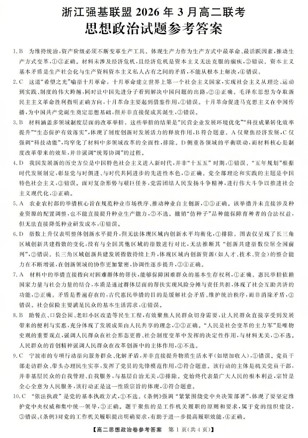 高二政治答案--浙江省强基联盟2025-2026学年高二3月联考
