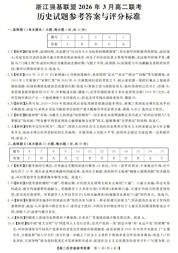 高二历史答案--浙江省强基联盟2025-2026学年高二3月联考