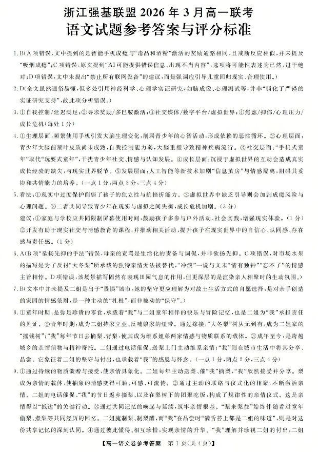 高一语文答案--浙江省强基联盟2025-2026学年高一3月联考