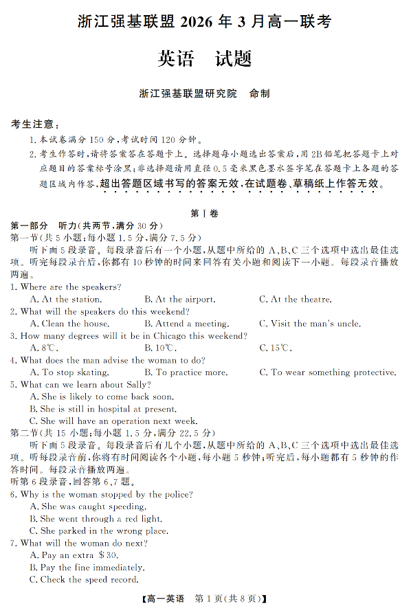 高一英语--浙江省强基联盟2025-2026学年高一3月联考