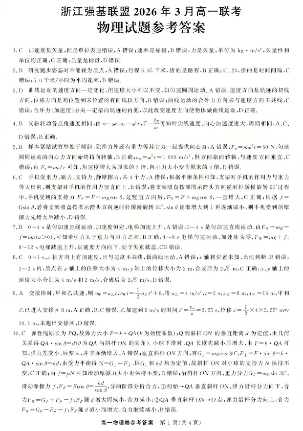 高一物理答案--浙江省强基联盟2025-2026学年高一3月联考
