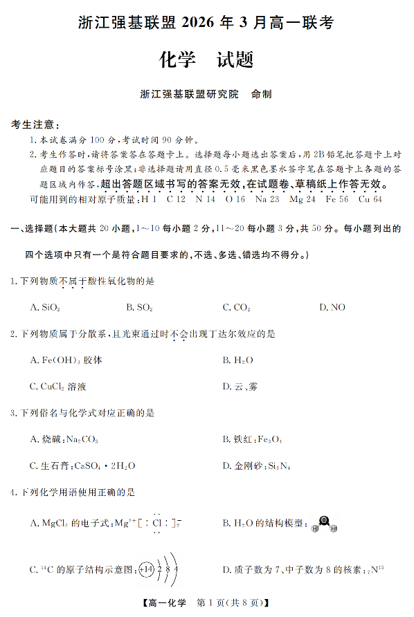 高一化学--浙江省强基联盟2025-2026学年高一3月联考
