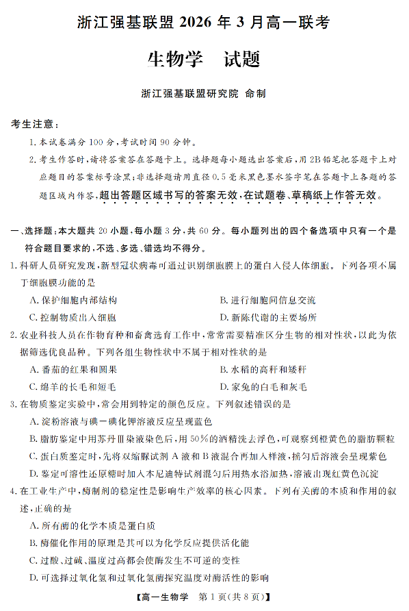 高一生物--浙江省强基联盟2025-2026学年高一3月联考