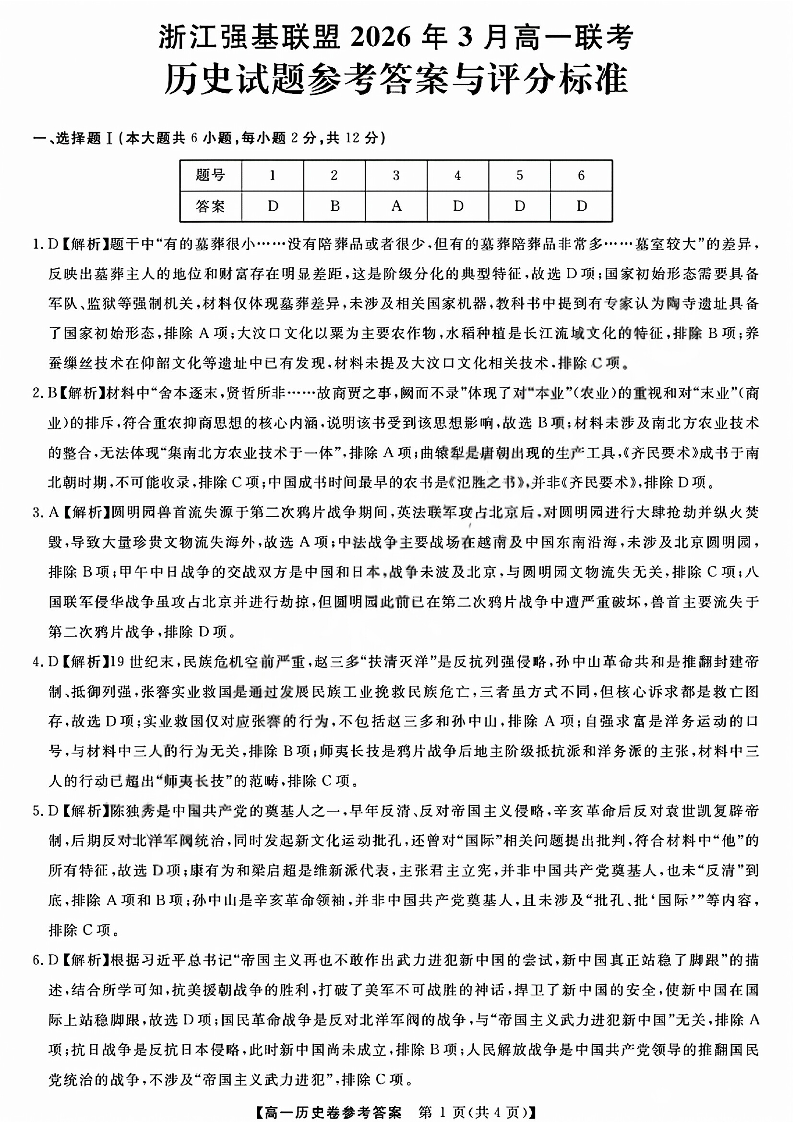 高一历史答案--浙江省强基联盟2025-2026学年高一3月联考