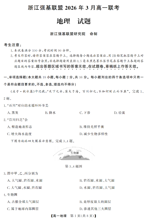 高一地理--浙江省强基联盟2025-2026学年高一3月联考