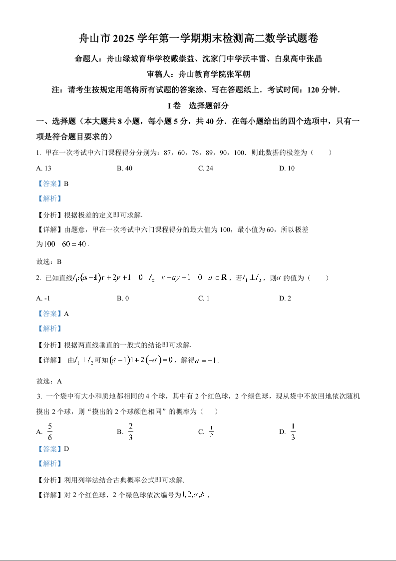 高二数学答案--浙江省舟山市2025-2026学年高二上学期期末考试